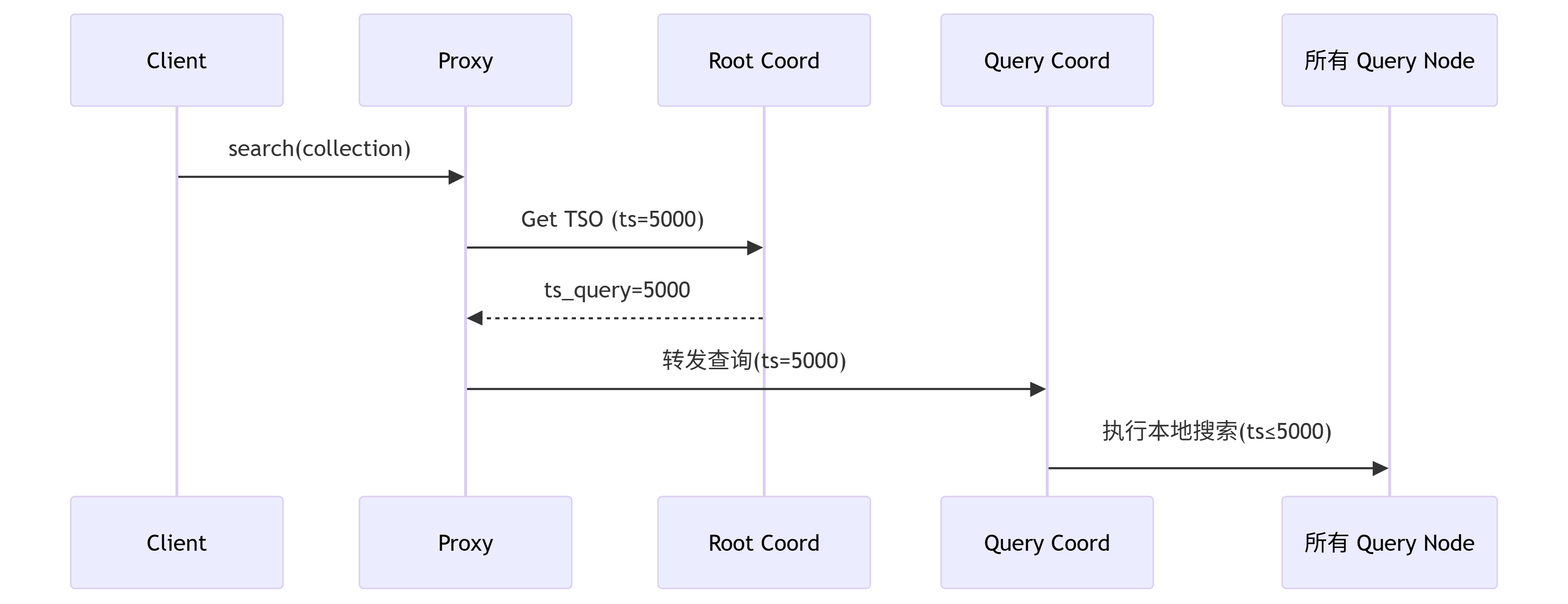 - Query Coord 从 Root Coord 获取时间戳 (TSO),保证读取一致性(快照隔离)。