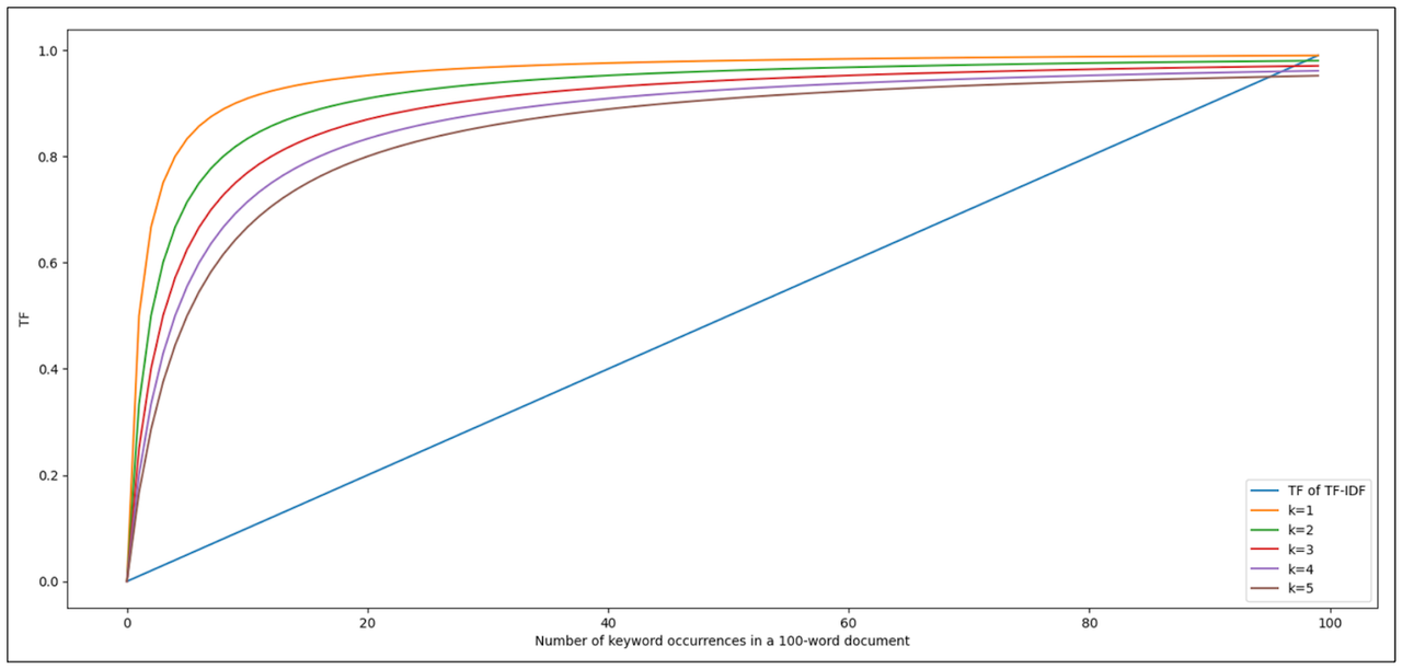 ,是控制词频饱和度的核心。 正如您所见,前几次关键词出现对整体TF分数的影响很大,导致分数迅速上升。然而,随着关键词在文档中出现的次数(