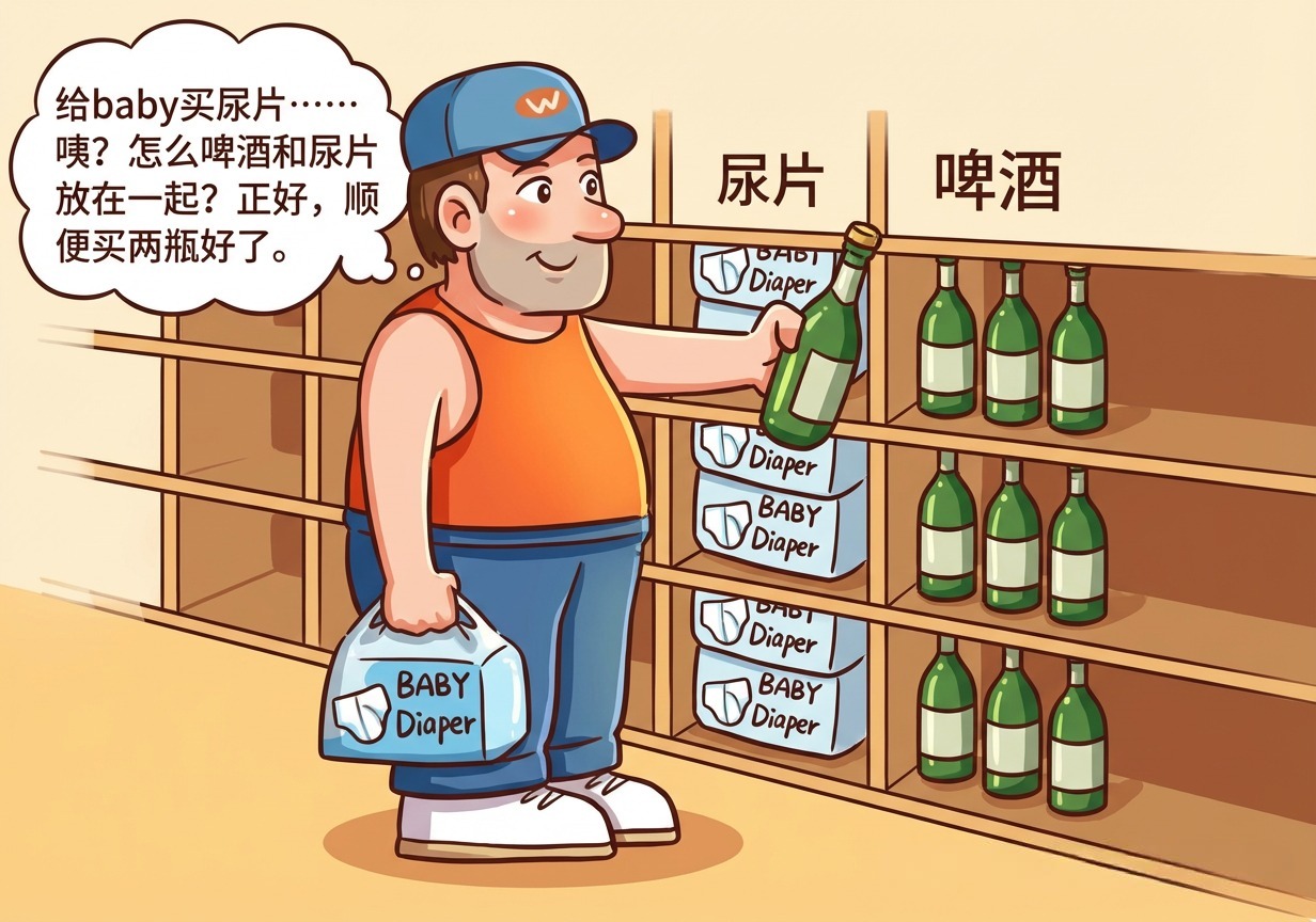 即便故事细节在不同来源中有所出入,它仍然很好地说明了一个要点:数据里可能隐藏着人类直觉不容易想到的行为模式。一种常见解释是:在特定时间段,部分家庭由父亲在下班路上顺带购买尿不湿;在完成"家庭任务"后,顺手买点啤酒作为放松,于是形成了高频组合。无论你是否把它当作严格可考的历史事实,这个案例都足以帮助理解"关联挖掘"的直觉。