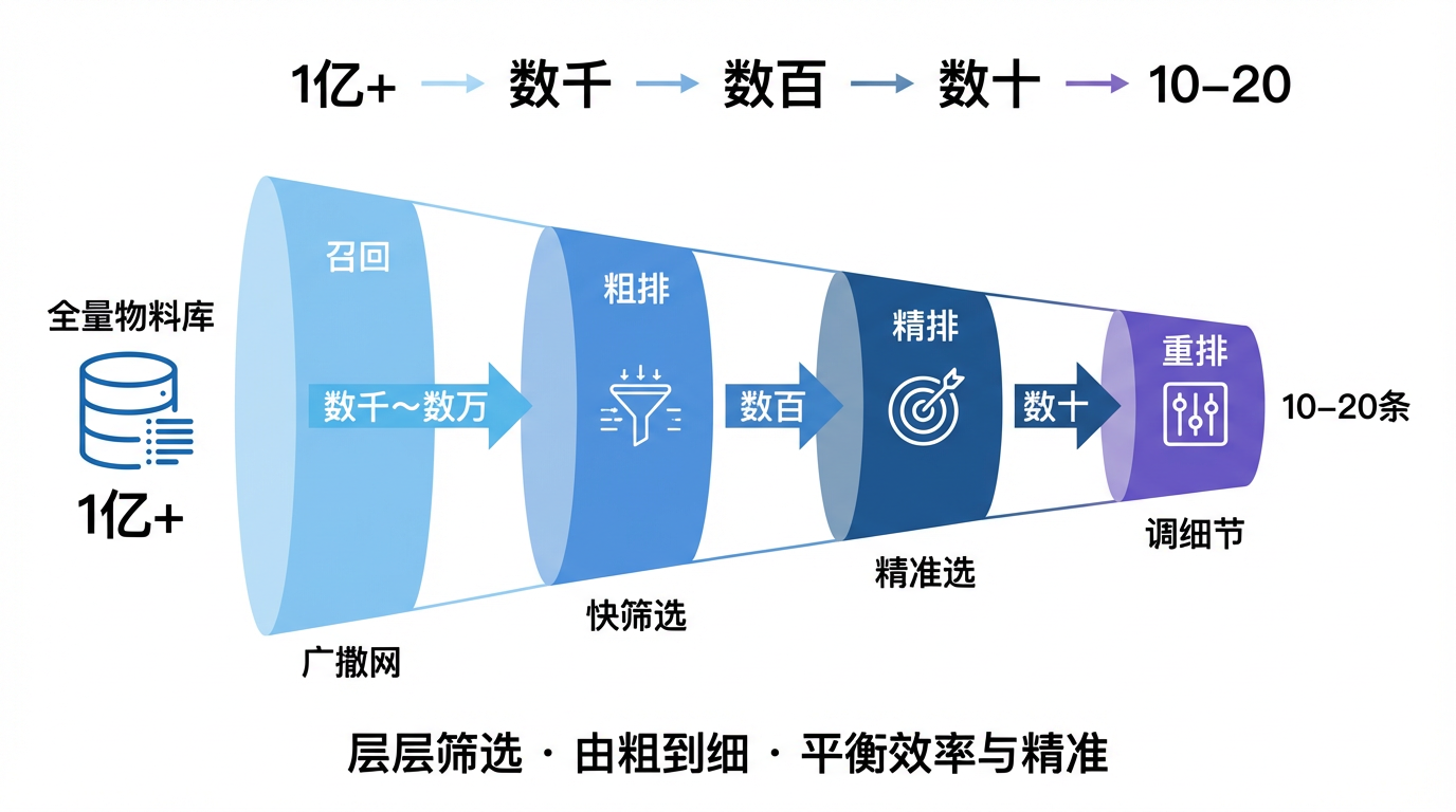 简单说,多级架构的核心目的是:从海量物品中,以"由粗到细、层层筛选"的方式,快速找到既符合用户兴趣、又满足平台需求的优质物品,平衡"效率"(快速筛选)和"效果"(精准推荐)。下面我们逐一拆解每一层的作用: