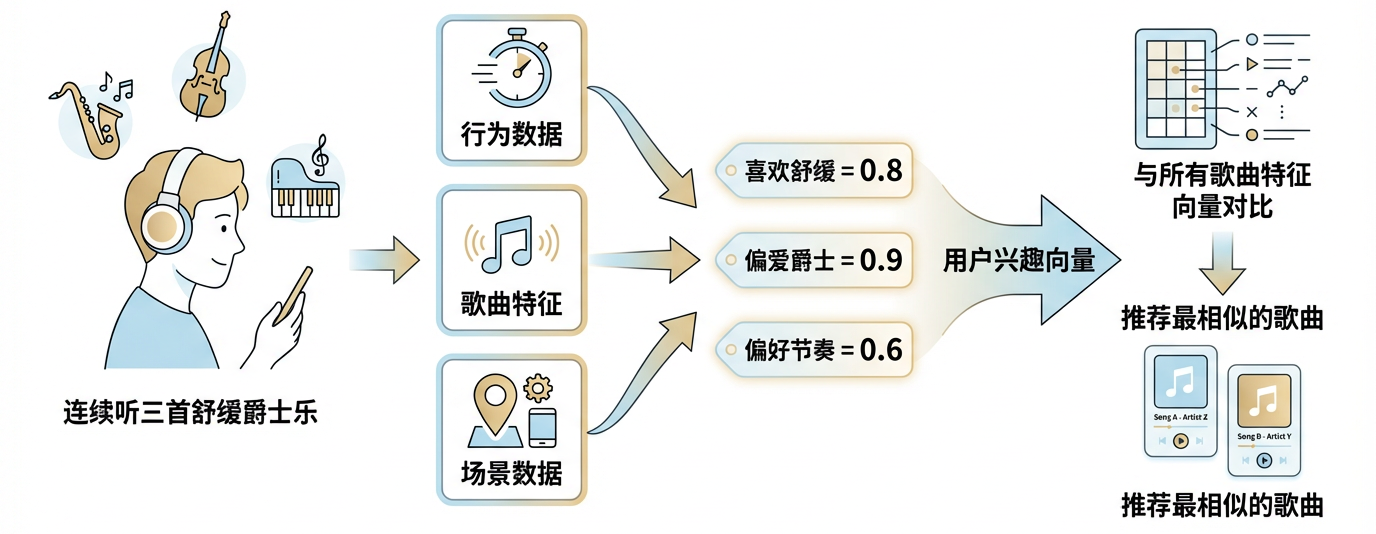 更重要的是,推荐系统重塑了我们获取信息的方式,甚至改变了认知路径:在搜索引擎主导的信息时代,更像"提问 → 回答"——用户先明确问题,再用关键词检索;在推荐系统主导的场景里,更像"反馈 → 接收"——用户不必明确表达需求,只需对内容给出正向/负向反馈(如点赞、收藏为正向反馈,划走为负向反馈),系统据此持续调整分发方向,实现与兴趣的动态匹配。它既能满足既有兴趣,也可能拓展认知边界——例如偏好爵士的用户,会被推荐到带爵士元素的流行乐,从而接触到新的音乐类型。