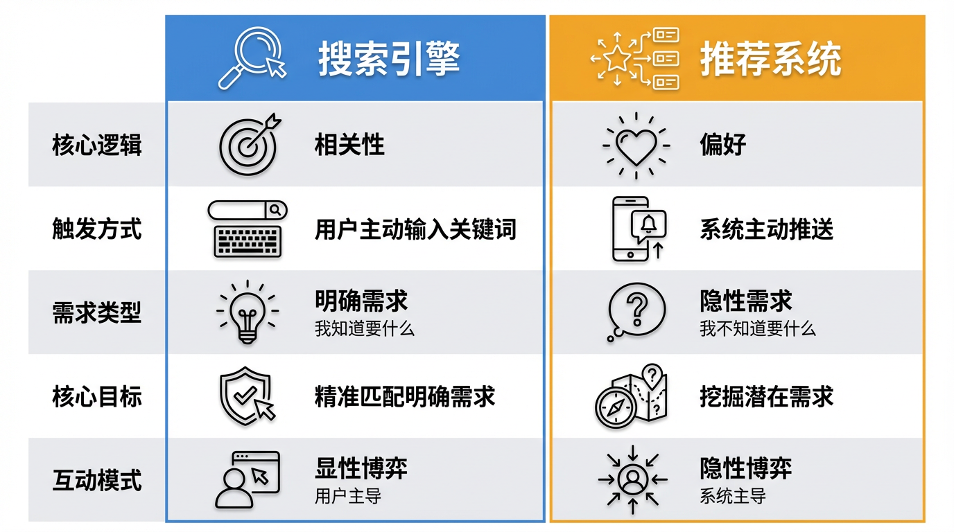 理解了信息获取的三个阶段,我们很自然会问:搜索引擎已经很强大了,为什么还需要推荐系统?它们的核心区别在于意图的主动性。